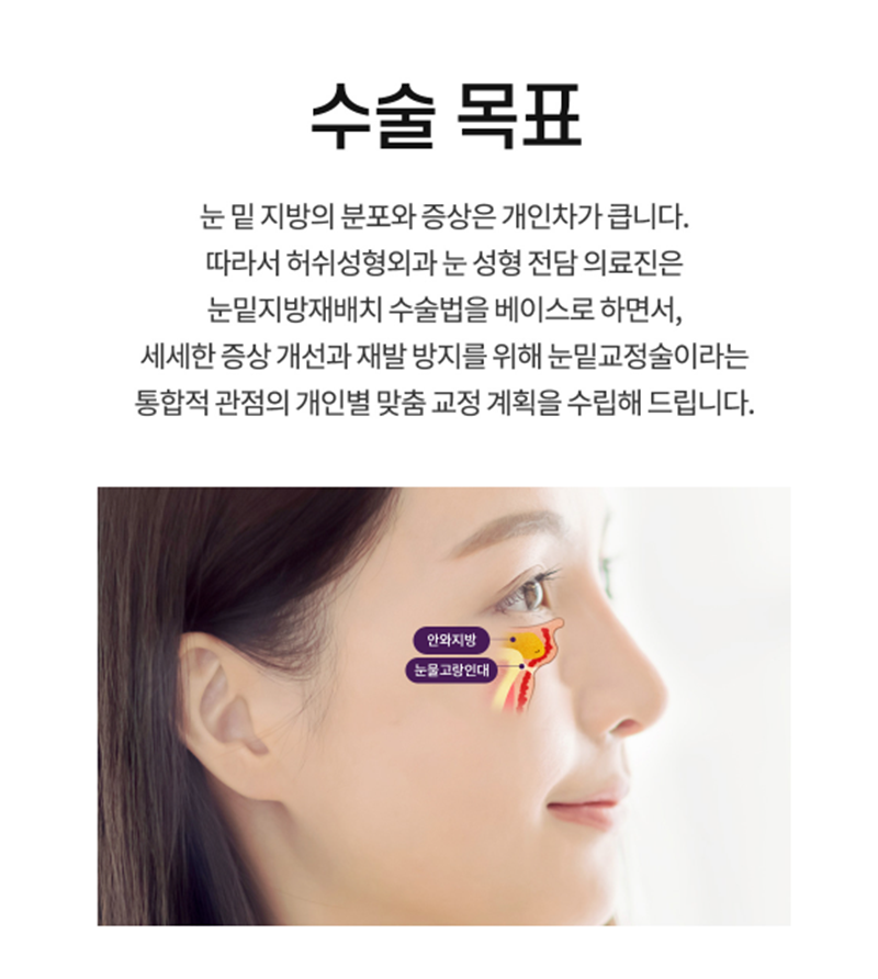 눈밑 지방은 단순 피로 문제가 아니라 구조적 요인일 가능성이 있습니다. 무조건 제거가 답이 아니라 현재 상태에 맞는 접근을 선택하는 것이 중요합니다. 충분한 상담을 통해 자연스러운 인상 변화를 목표로 계획을 세우는 것이 좋습니다. |