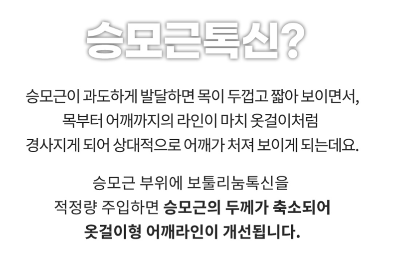 사진을 찍을 때 어깨가 유독 답답해 보이거나, 상체 라인이 둔해 보인다는 이야기를 들어본 적 있으신가요? 이럴 때 가장 먼저 떠올리는 시술이 바로 승모근 보톡스입니다. 과도하게 발달한 승모근의 긴장을 완화해 어깨 라인을 정리해 주는 방식으로, 상체 인상을 보다 부드럽게 만드는 데 도움을 줄 수 있어요. 다만 상담을 하다 보면 이런 질문을 많이 받습니다. “승모근 보톡스만으로 충분할까요?” “효과를 더 잘 느끼려면 같이 하면 좋은 시술도 있나요?” 오늘은 이런 고민을 가진 분들을 위해 승모근 보톡스 효과를 높이기 위해 함께 고려해볼 수 있는 시술들을정리해 드릴게요. 승모근 보톡스, 어떤 효과를 기대할 수 있을까? 승모근 보톡스는 과도하게 긴장된 근육의 힘을 완화해 어깨선이 완만해 보이도록 돕는 시술입니다.특히!1. 상체에 비해 어깨가 도드라져 보이는 체형2. 목이 짧아 보인다는 인상을 자주 듣는 경우3. 긴장성 승모근이 발달한 경우이런 분들에게 고려되는 경우가 많아요.다만 근육만 원인인 경우와, 체형·라인 요소가 함께 작용하는 경우는 다를 수 있기 때문에개인별 상태에 따라 체감 효과에도 차이가 생길 수 있습니다.승모근 보톡스와 함께 고려되는 시술은? 1. 어깨필러 어깨가 처져 보이거나 승모근은 줄어들었지만 라인이 밋밋해 보이는 경우라면 어깨 필러가 함께 언급됩니다. 어깨필러는 쇄골부터 어깨로 이어지는 라인을 정리하고 상체 비율이 보다 균형 있어 보이도록 돕는 방향으로 활용됩니다.승모근 보톡스로 불필요한 볼륨을 줄이고, 필요한 부분에만 라인을 보완해 주는 개념으로 이해하시면 좋을 거 같습니다.2. 상체 라인 리프팅 피부 탄력이나 처짐이 함께 고민되는 경우에는 리프팅 계열 시술이 함께 고려되기도 합니다. 리프팅은 피부 탄력 관리, 목과 어깨 경계 라인을 정리하는 데 도움을 줄 수 있어 근육 중심의 보톡스와는 접근 방식이 다릅니다. 3. 팔, 상체 체형 관리 시술 어깨는 정리됐지만 "상체가 여전히 커 보이는 느낌"이 남는 경우도 있습니다. 이럴 때는 승모근만 단독으로 보기보다 상체 전체 라인을 함께 살펴보는 접근이 도움이 됩니다. 중요한 건 무조건 여러 시술을 하는 것이 아니라 왜 이런 인상이 생기는지 원인을 먼저 정리하는 것이에요.